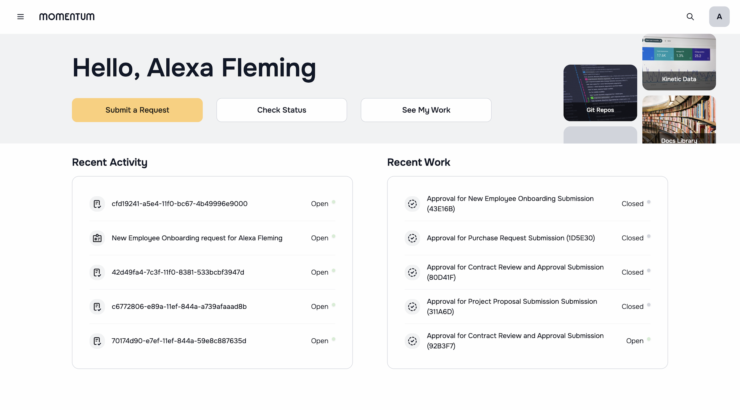 Using the Kinetic Platform’s form and workflow capabilities, we built an experience where customers could submit installation and migration requests, manage support tickets, view summaries of their data, and track status updates within a single system.